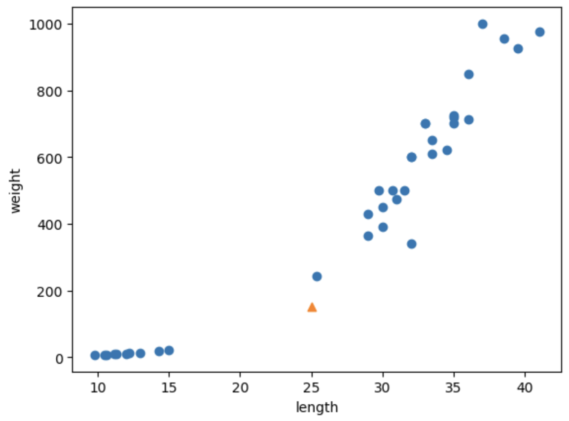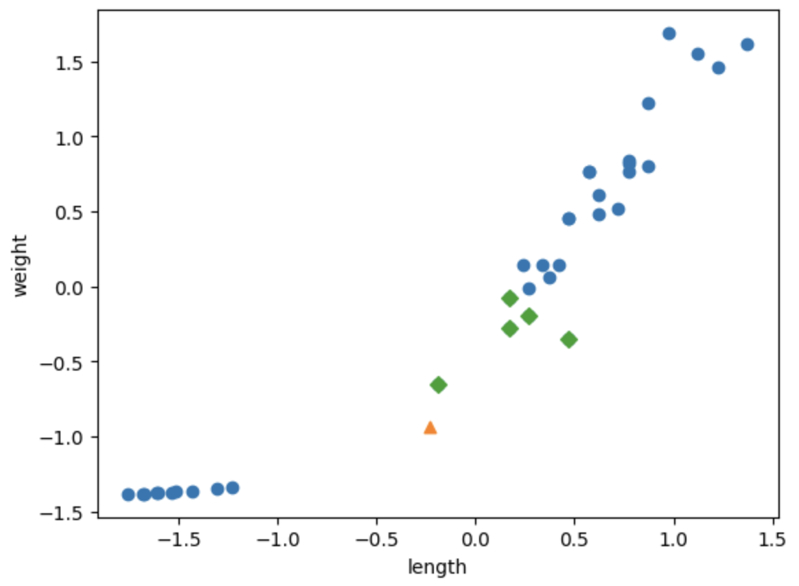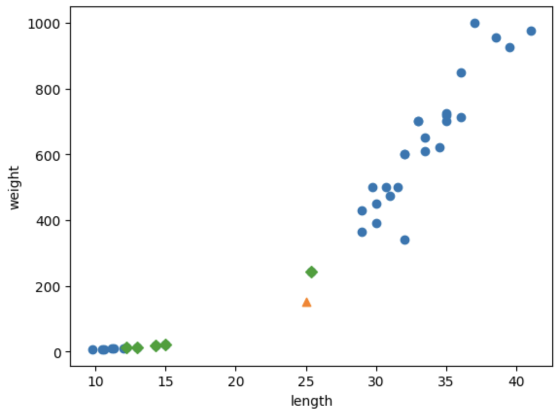 marker='D'로 지정하면 산점도를 마름모로 그립니다. 예측 결과와 마찬가지로 가장 가까운 이웃에 도미가 하나밖에 포함되지 않았습니다. 산점도를 보면 직관적으로 도미와 가깝게 보이는데 말이죠.