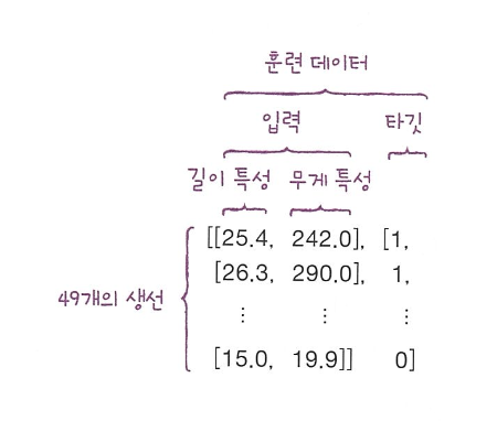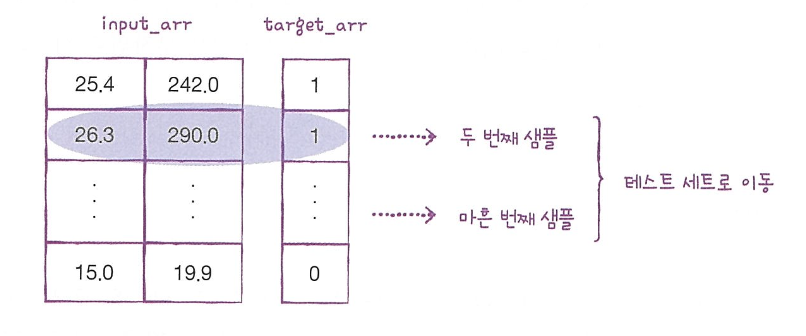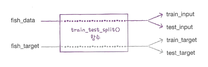 fish_data와 fish_target 2개의 배열을 전달했으므로 2개씩 나뉘어 총 4개의 배열이 반환됩니다. 차례대로 처음 2개는 입력 데이터(train_input, test_input), 나머지 2개는 타깃 데이터(train_target, test_target)입니다. 랜덤 시드(random_state)는 42로 지정했습니다.