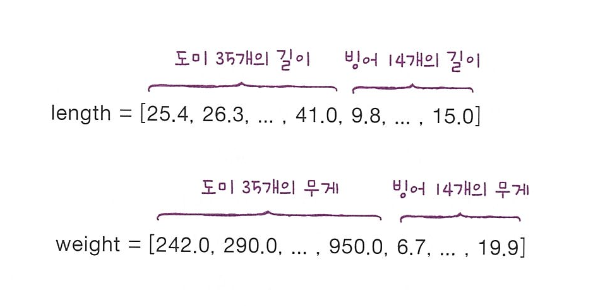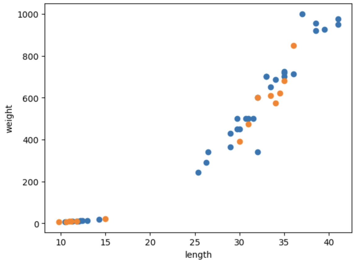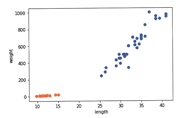 도미와 빙어 데이터를 하나의 데이터로 합치겠습니다.