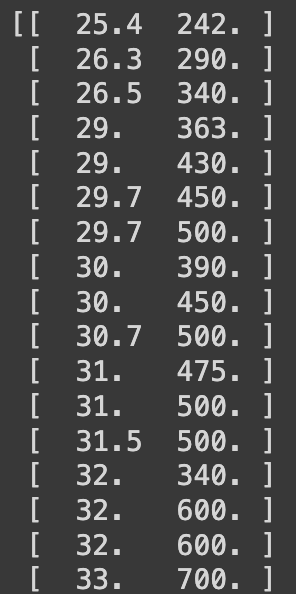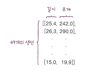 사이킷런 패키지를 사용하려면 다음처럼 각 특성의 리스트를 세로 방향으로 늘어뜨린 2차원 리스트를 만들어야 합니다.