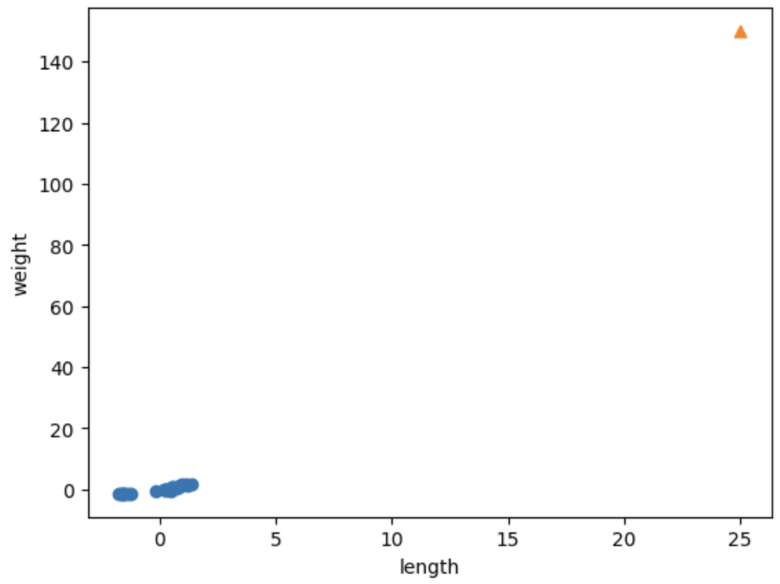 훈련 세트를 mean(평균)으로 빼고 std(표준편차)로 나누어 주었기 때문에 값의 범위가 크게 달라졌습니다. 샘플 [20, 150]을 동일한 비율로 변환하지 않으면 이런 현상이 발생하겠죠.