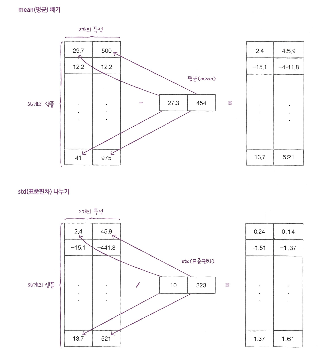 넘파이는 train_input의 모든 행에서 mean에 있는 두 평균값을 빼줍니다. 그다음 std에 있는 두 표준편차를 다시 모든 행에 적용합니다. 이런 넘파이 기능을 브로드캐스팅이라고 부릅니다.