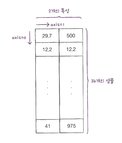 np.mean() 함수는 평균을 계산하고, np.std() 함수는 표준편차를 계산합니다. train_input은 (36, 2) 크기의 배열입니다. 특성마다 값의 스케일이 다르므로 평균과 표준편차는 각 특성별로 계산해야 합니다. 이를 위해 axis=0으로 지정했습니다. 이렇게 하면 행을 따라 각 열의 통계 값을 계산합니다.
