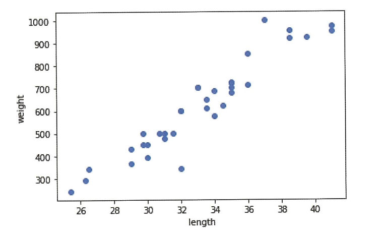 두 특성을 숫자로 보는 것보다 그래프로 표현하면 데이터를 더 잘 이해할 수 있고 앞으로 할 작업에 대한 힌트를 얻을 수도 있습니다. 길이를 x축으로 하고 무게를 y축으로 정하겠습니다. 그다음 각 도미를 이 그래프에 점으로 표시해 보죠. 이런 그래프를 산점도라고 부릅니다.