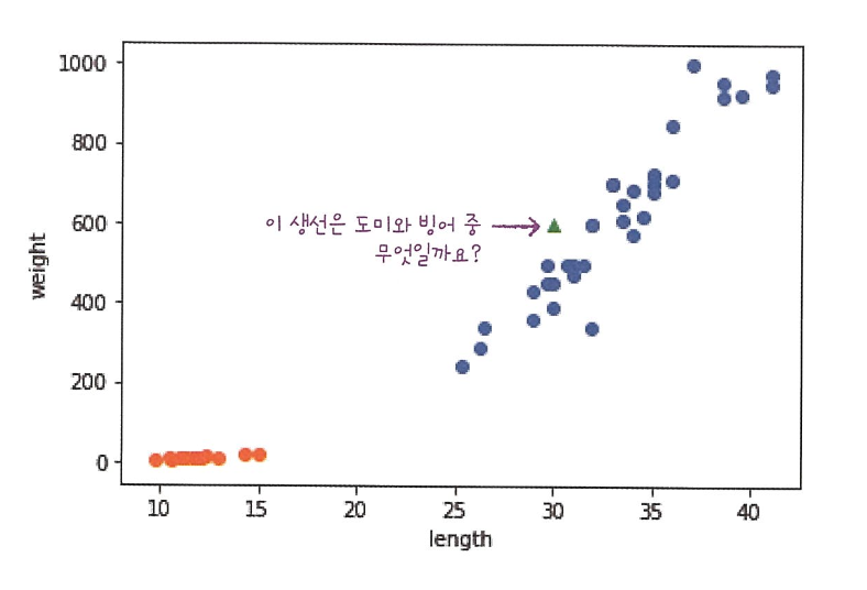 -> 하지만 30cm보다 큰 생선이 무조건 도미라고 말할 수 없습니다. 머신러닝은 누구도 알려주지 않는 기준을 찾아서 일을 합니다. 머신러닝은 기준을 찾을 뿐만 아니라 이 기준을 이용해 생선이 도미인지 아닌지 판별할 수도 있습니다.