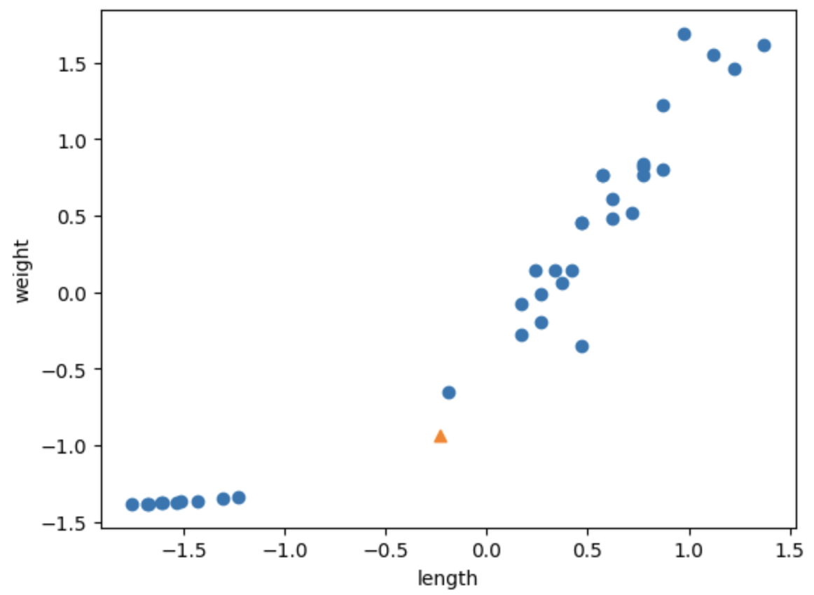 마지막으로 kneighbors() 함수로 이 샘플의 k-최근접 이웃을 구한 다음 산점도로 그려 보겠습니다. 특성을 표준점수로 바꾸었기 때문에 가장 가까운 이웃에 변화가 생겼을 것으로 기대할 수 있습니다.