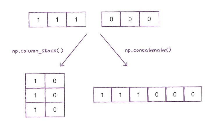 이 두 함수를 사용해 1이 35개인 배열과 0이 14개인 배열을 간단히 만들 수 있습니다. 그다음 두 배열을 그대로 연결하면 됩니다. 여기에서는 np.column_stack() 함수를 사용하지 않고 첫 번째 차원을 따라 배열을 연결하는 np.concatenate() 함수를 사용합니다.