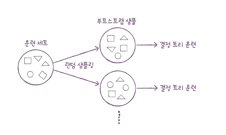 먼저 랜덤 포레스트는 각 트리를 훈련하기 위한 데이터를 랜덤하게 만드는데, 이 데이터를 만드는 방법이 독특합니다. 우리가 입력한 훈련 데이터에서 랜덤하게 샘플을 추출하여 훈련 데이터를 만듭니다. 이때 뽑았던 샘플을 다시 넣기 때문에 한 샘플이 중복되어 추출될 수도 있습니다. 이렇게 만들어진 샘플을 부트스트랩 샘플이라고 부릅니다. 기본적으로 부트스트랩 샘플은 훈련 세트의 크기와 같게 만듭니다.