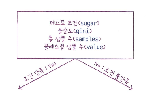 노드는 결정 트리를 구성하는 핵심 요소입니다. 노드는 훈련 데이터의 특성에 대한 테스트를 표현합니다. 가지(branch)는 테스트의 결과(True, False)를 나타내며 일반적으로 하나의 노드는 2개의 가지를 가집니다.