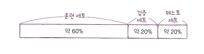 테스트 세트를 사용하지 않고 훈련 세트를 또 나눠서 과대적합, 과소적합을 판단하는 데이터를 검증 세트라고 부릅니다.