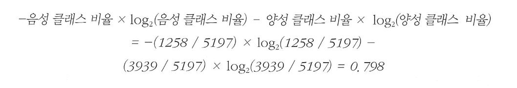부모 노드와 자식 노드의 불순도 차이를 계산하는 방법은 다음과 같습니다. 먼저 자식 노드의 불순도를 샘플 개수에 비례하여 모두 더합니다ㅏ. 그다음 부모 노드의 불순도에서 빼면 됩니다.